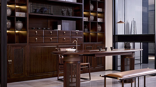 600岁的故宫不服老,于是便有了在大雪纷飞的日子里吃铜炉火锅喝半糖拿铁的别样风情;《经典咏流传》以千年诗词成就绝唱,让世界听见东方的时代强音;圣华国际家居把《清明上河图》及《缂丝万年如意图》等中国传统元素运用于「吉至」系列家具设计,将华夏千年厚重根脉埋藏于生活的方方面面,让世界看到东方美学。一入华夏,文脉澎湃不息。5000年文化长河沉淀智慧结晶,集众人之智,以美学和文化成就吉至独有符号,以“表于形,发于心”的东方美筑传世人居绝响。自古红黑出CP,吉至东方美学家具采用进口印尼黑酸枝和非洲黑檀木两种木材,红木华贵典雅,檀木沉稳温儒,承丰壤之滋润、受甘露之安抚、吸天地之灵气、孕日月之精华,一抹国风雅韵,怡神养性,达意传情。国之巨匠的不朽魅力,赋予我们开天辟地的力量,京匠出生的圣华以精工筑就极致金品,一件家具成就我们纵横千年的信仰,每一个细节都丝丝合缝,以东方园林建筑精绝的工艺与手法,精确每一个刻度,匠心独运,创构经典。日月轮转,动静无常。桌案巧借几何之形、环绕式休闲椅及内嵌式柜体,一席雅院感知生活温度,诠释出园林建筑的美学张力与东方文化形而上学的感官冲击,方寸之间,潜藏调和乾坤的气度,表里之行,存纳敬事如仪的衷肠。心之所“吉”,境之所“至”,吉至所愿,让世界看到东方美学。